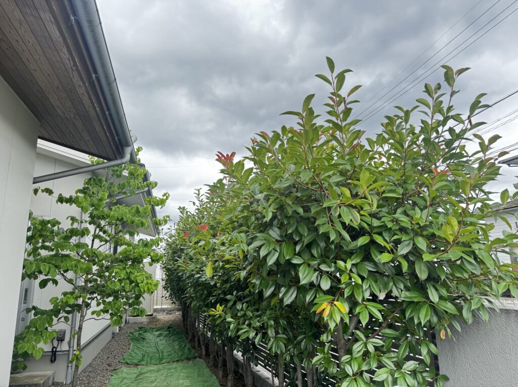 アカメガシの垣根です、生垣の剪定というと通常は刈り込んで形を整えることがほとんどですが鋏を使って刈り込まずに整えます!